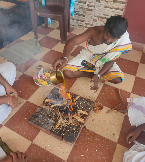 Thila (alias Gingelly) is offered in this homam. Lord Surya Bhagavan (sun) is worshiped in kalasha and mandala. Gayathri manthra and pitru dosha parihara mantras are chanted. Kalasha, phala and ajya daanas are given followed by Yama raja Pooja & homa then pinda pradanam is performed. Performing Thila homam at Rameswaram is very powerful and it gives Pitru-Moksha.